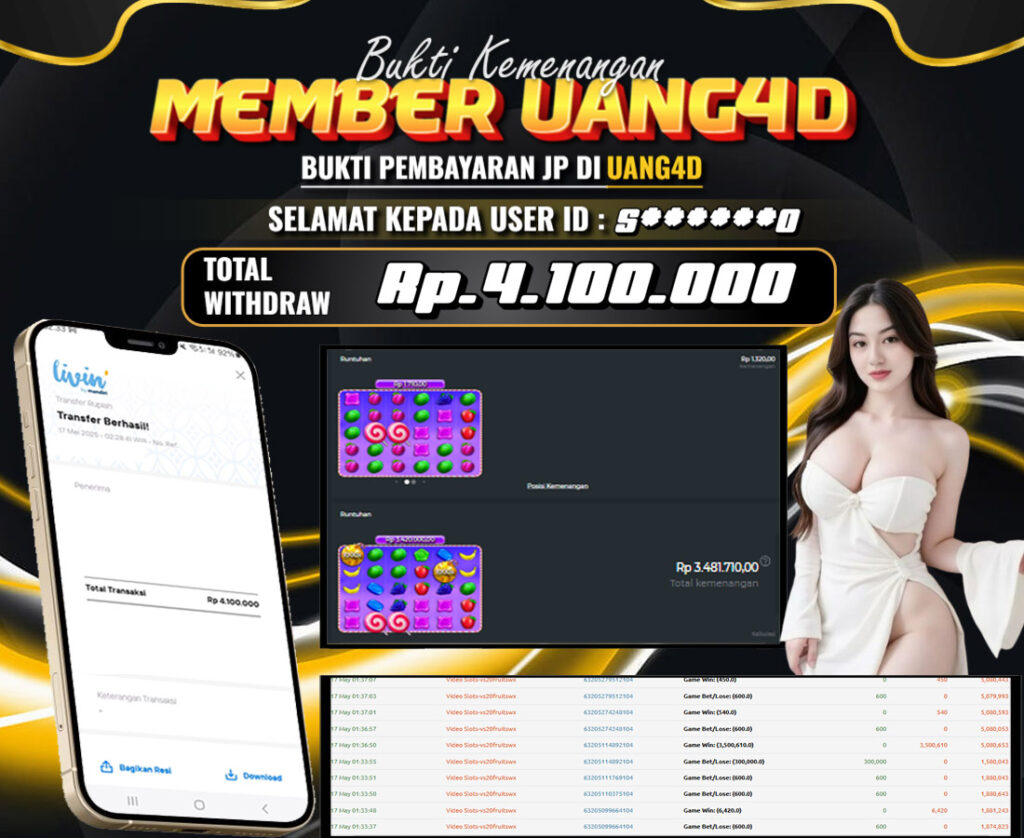 Jangan lewatkan kesempatan untuk meraih kemenangan besar. Daftar sekarang di UANG4D dan rasakan pengalaman bermain slot terbaik yang pernah ada! Putar gulungan, menangkan jackpot, dan jadilah bagian dari komunitas pemain sukses kami!