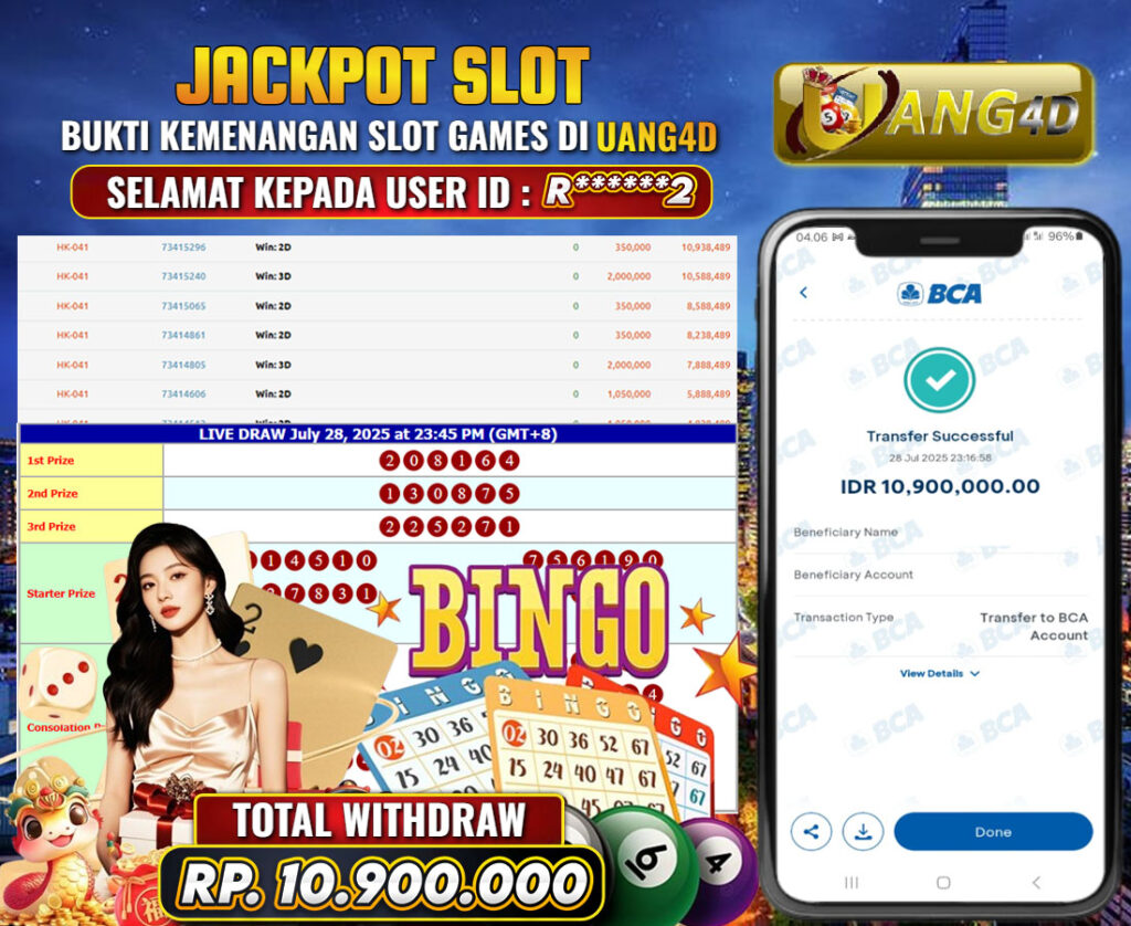 UANG4D dikenal sebagai situs terpercaya yang selalu menghadirkan pengalaman bermain slot online yang aman, fair, dan berlisensi resmi. Di sini, kami tidak hanya sekadar memberikan janji, tapi bukti nyata berupa slip kemenangan yang dapat Anda lihat secara langsung.