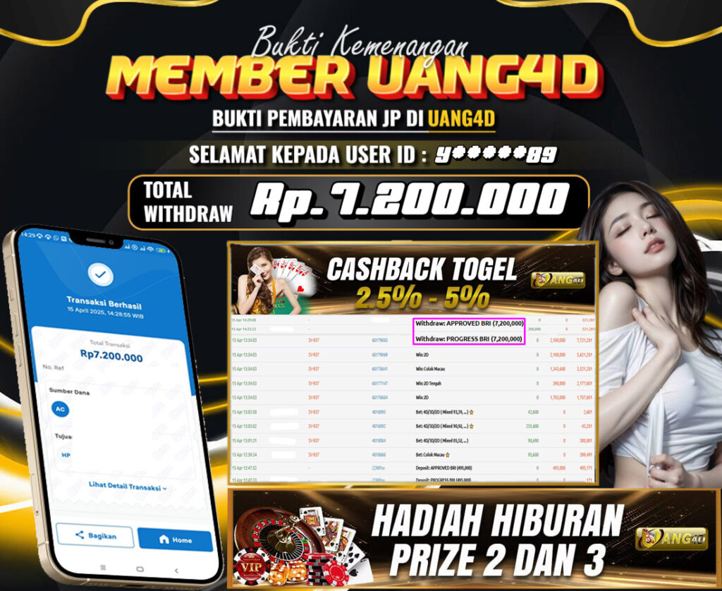 Setiap hari, member UANG4D berhasil meraih jackpot besar dari berbagai provider togel ternama yang kami sediakan, seperti Sydney, Singapore, Hongkong dan masih banyak lagi. Kami secara rutin menampilkan bukti screenshot atau rekapan kemenangan yang berhasil diraih, mulai dari kemenangan ratusan ribu hingga puluhan juta rupiah. Semua slip kemenangan ini kami hadirkan untuk membuktikan bahwa di UANG4D, peluang menang itu nyata.