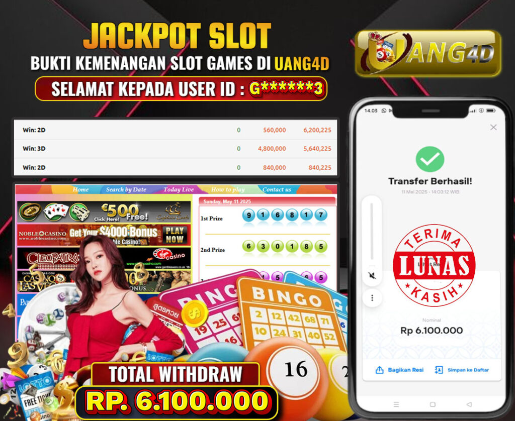 UANG4D dikenal sebagai situs terpercaya yang selalu menghadirkan pengalaman bermain slot online yang aman, fair, dan berlisensi resmi. Di sini, kami tidak hanya sekadar memberikan janji, tapi bukti nyata berupa slip kemenangan yang dapat Anda lihat secara langsung.