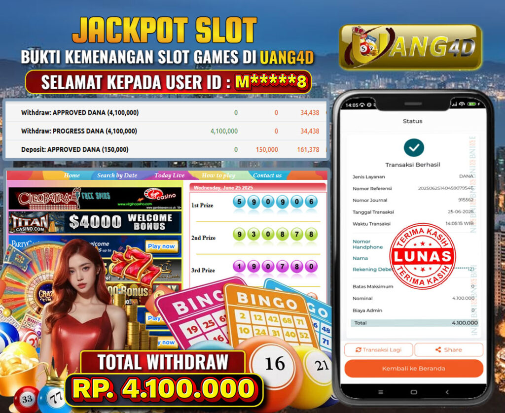 UANG4D dikenal sebagai situs terpercaya yang selalu menghadirkan pengalaman bermain slot online yang aman, fair, dan berlisensi resmi. Di sini, kami tidak hanya sekadar memberikan janji, tapi bukti nyata berupa slip kemenangan yang dapat Anda lihat secara langsung.